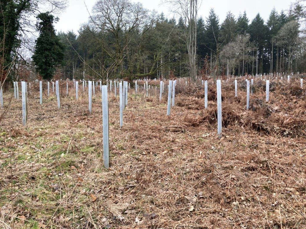 The maintenance in plantations includes putting back up fallen tree shelters, replacing rotten tree shelter stakes, and beating up – replacing failed whips. The undergrowth in some areas is in danger of smothering these tree shelters and excluding light to the new trees. The clearance of scrub is carried out by brush cutting.
