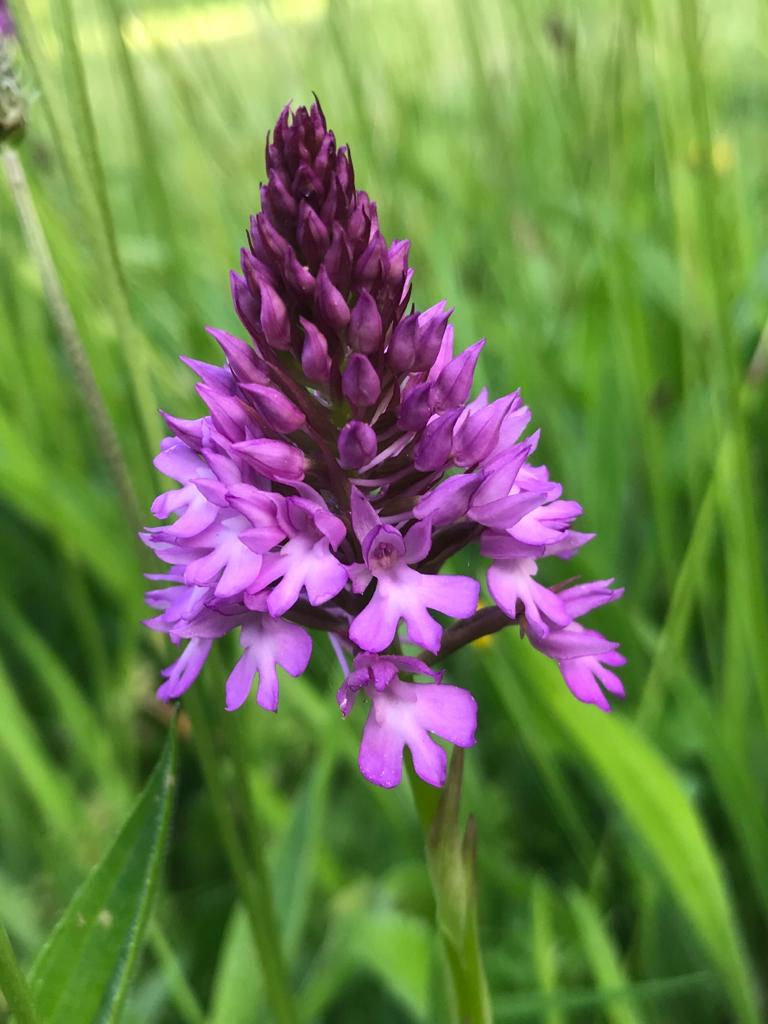 I think my favourite is the Pyramidal Orchid which has a conical flower of striking purple. It is pollinated by butterflies and moths.